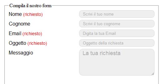 – Placeholder e’ la scritta che appare dentro il form, una sorta di segnaposto, potete anche eliminarla se non vi aggrada, potete inserire informazioni utili alla compilazione corretta del vostro form.